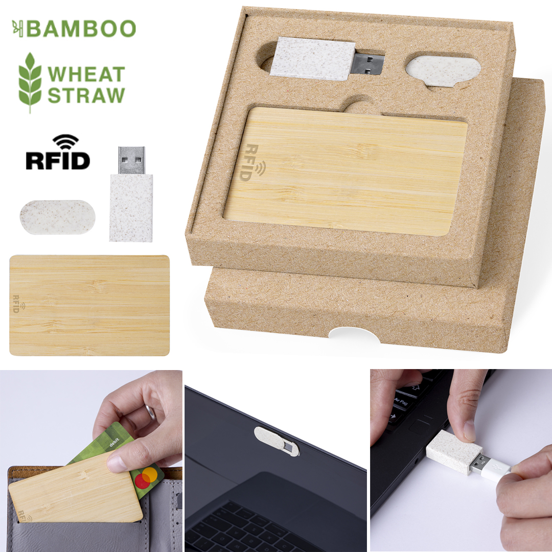 Práctico set de seguridad y privacidad. Incluye una tarjeta con protección de RFID fabricada en bambú, tapa webcam fabricada en caña de trigo y un bloqueador de datos fabricado en caña de trigo, evitando el traspaso de datos y permitiendo cargar el dispositivo. Presentado en elegante caja con compartimento troquelado para cada accesorio. Materiales como el bambú fomentan la utilización de materias primas naturales, reduciendo las emisiones contaminantes. Proviene de una planta de gran resistencia y versatilidad, con crecimiento y regeneración rápidos, siendo una excelente alternativa al uso de madera tradicional. Tarjeta Protector RFID, Bambú. Tapa Webcam Caña de Trigo/ ABS, Adhesivo. Bloqueador de Datos Caña de Trigo/ ABS