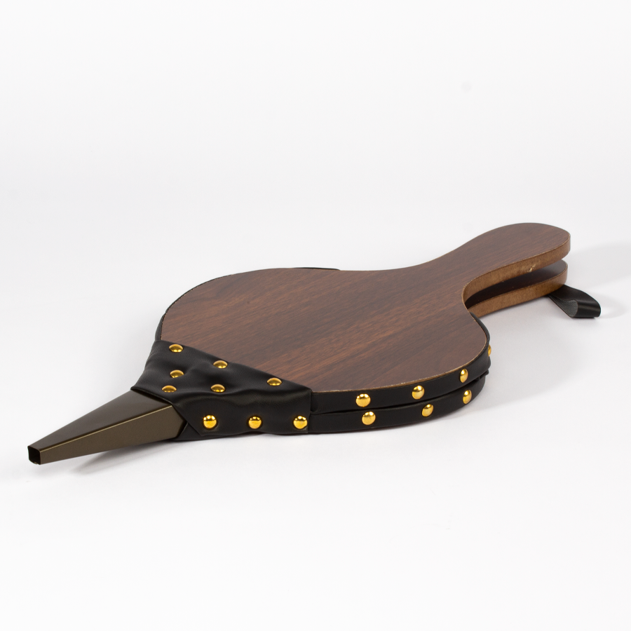 Soplador grande de aire tipo Acordeón, para chimeneas y parrillas. Superficie MDF, reforzado con cuero y tachas. Toma de aire posterior. Amplia superficie para logo.
