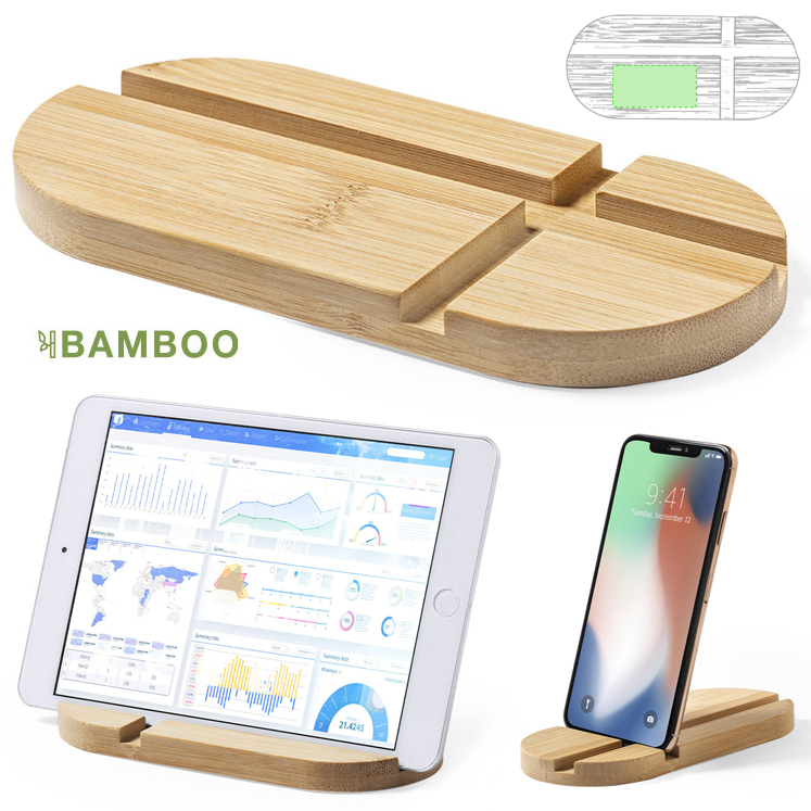 Original y sencillo soporte de línea nature para smartphone y tablet. Fabricado en bambú procedente de cortes naturales. Presentado en atractiva caja individual de diseño eco.