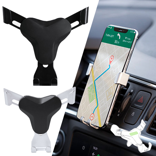 Ingenioso soporte para smartphone de diseño minimalista y especialmente diseñado para smartphones tamaño XXL. Con sistema de fijación universal que se activa por el propio peso del teléfono, ajustando las pinzas de agarre una vez que se sitúa el dispositivo en el soporte. Para rejilla de ventilación del automóvil y con frontal especialmente diseñado para marcaje en tampografía. Ajustable