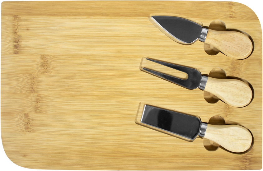 29,8 x 18,7 x 1,2 cm. Bambú y Acero inoxidable . Tabla de bambú con set de 3 utensilios de acero inoxidable 210 con mango de madera: 2 cuchillos y 1 tenedor. Tabla para cortar y presentar diferentes quesos acompañada de un buen vino tinto en tus próximas reuniones. Presentación en caja de regalo.
