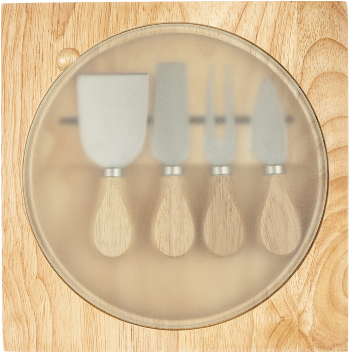 23 x 23 x 2,5 cm. Madera. Tabla para quesos. En la parte interna contiene imán que sostiene 4 utensilios de acero inoxidable y mango de madera. Tabla circular de vidrio templado Ø 20 cm. Presentación en caja de regalo.