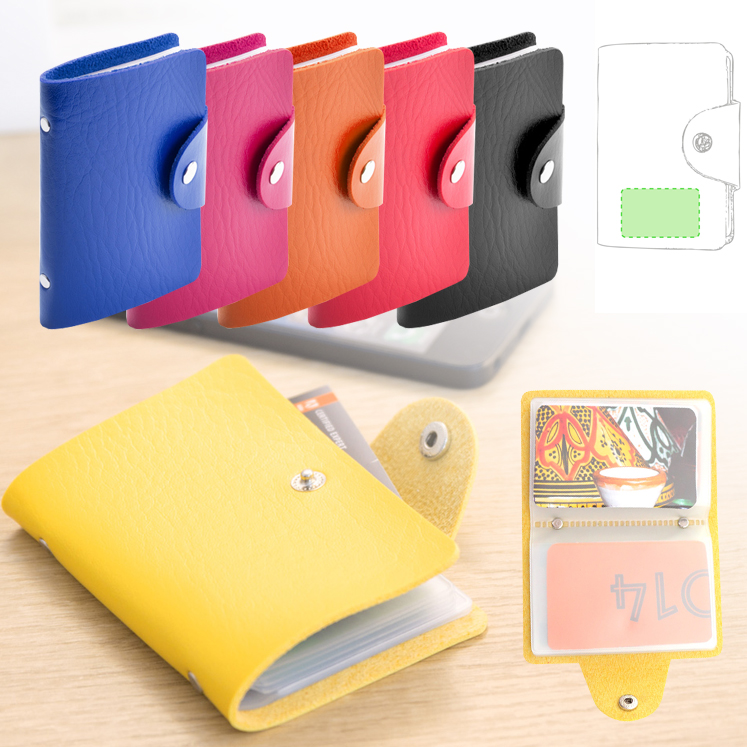 Tarjetero con cuerpo en suave acabado en polipiel de llamativos colores y cierre de corchete metálico. Con tachuelas de refuerzo metálicas en el lomo y 10 compartimentos interiores en resistente PVC transparente. 10 Compartimentos