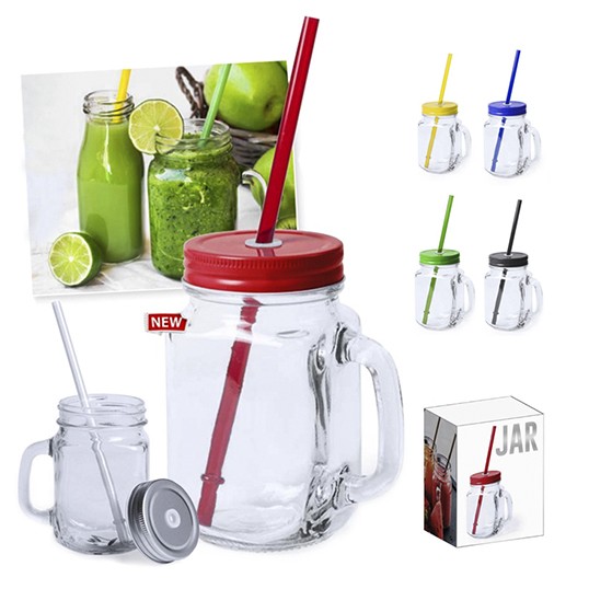 Tarro multiusos de cristal de 500ml de capacidad con tapa y pajita en vivos colores. Con tapa metálica a rosca y presentado en atractiva caja de diseño. 500 ml