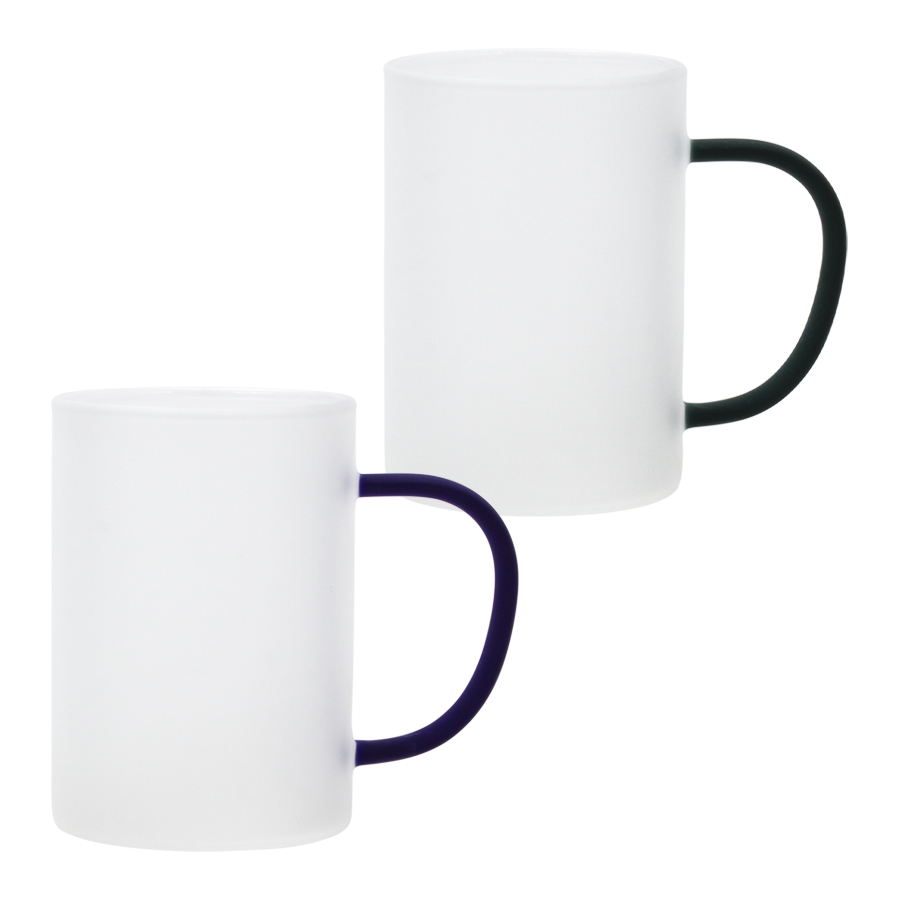 Tazón de Vidrio Empavonado para Sublimación, para líquidos fríos, con asa de color sólido. Capacidad 330ml. Presentación bolsa plástica empavonada + caja de cartón blanco. Calidad Premium ORCA.