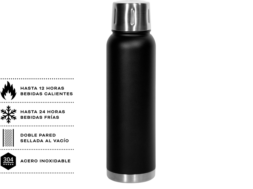Ø 8,4 x 30 cm. Capacidad 1000 ml. Acero inoxidable. Termo Doble pared con recubrimiento de cobre. Interior en acero 304 y exterior en acero 201. Pintura Powder Coat (pintura mas duradera y resistente a la corrosión y el paso del tiempo). Tapa de acero a rosca. Tapón con apertura y cierre a presión. Mantiene por más de 12 hs la temperatura de las bebidas calientes y 24 hs de las bebidas frías. Presentación en caja de regalo.