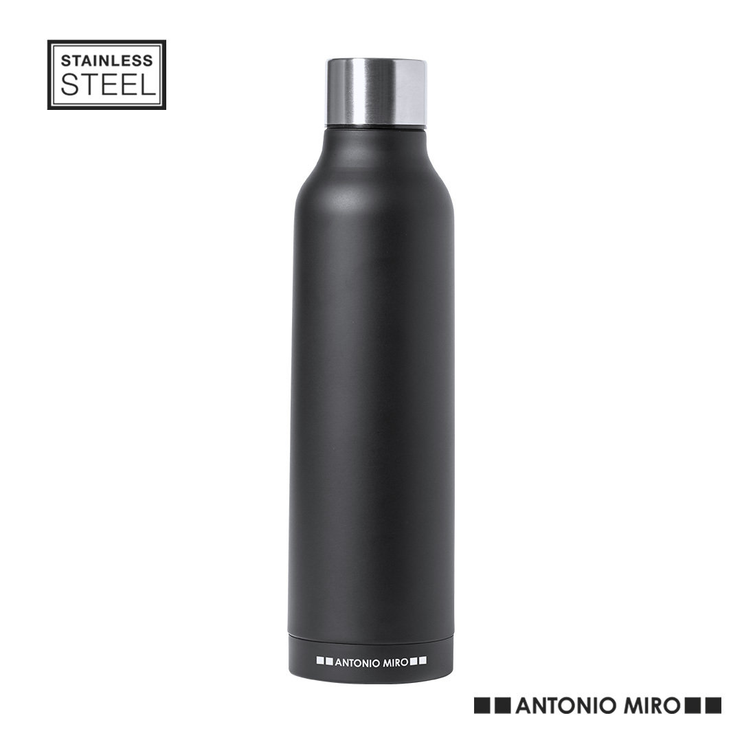 Termo en acero inox de Antonio Miró. De 500ml de capacidad y con doble pared para mejor y más duradera conservación de la temperatura. De sobrio acabado en negro satinado, logotipo de la marca en la base y con tapón cromado a rosca. Presentado en atractiva caja de diseño con logotipo de la marca. 500 ml
