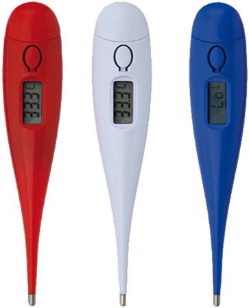 Termómetro digital de fácil uso en variada gama de colores. Presentado en resistente estuche transparente. Pilas de botón incluidas. Pila Botón Incluida