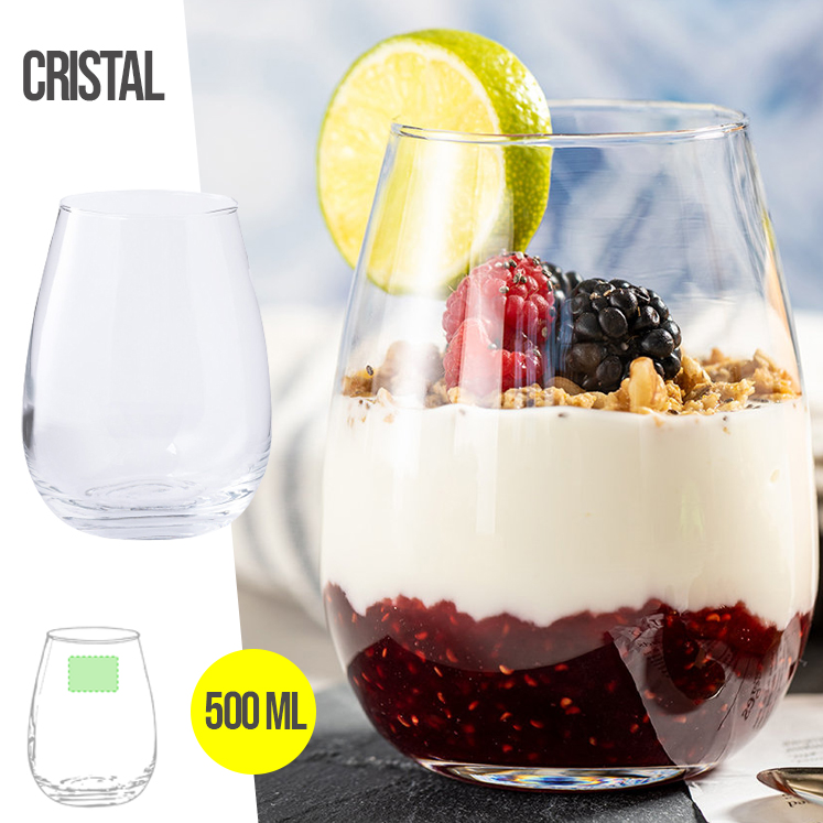Vaso de cristal de 500ml de capacidad. Con atractivo diseño curvado y presentado en caja individual de diseño kraft. 500 ml